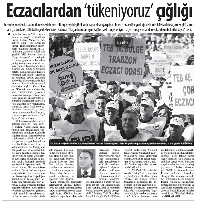 Türkiye’nin dört bir yanında gelen meslektaşlarımızın katılımıyla alanlara sığamadığımız, coşkuyla tek ses tek yürek olduğumuz Büyük Eczacı Mitingimiz ulusal basında ve internet medyasında geniş yer buldu.